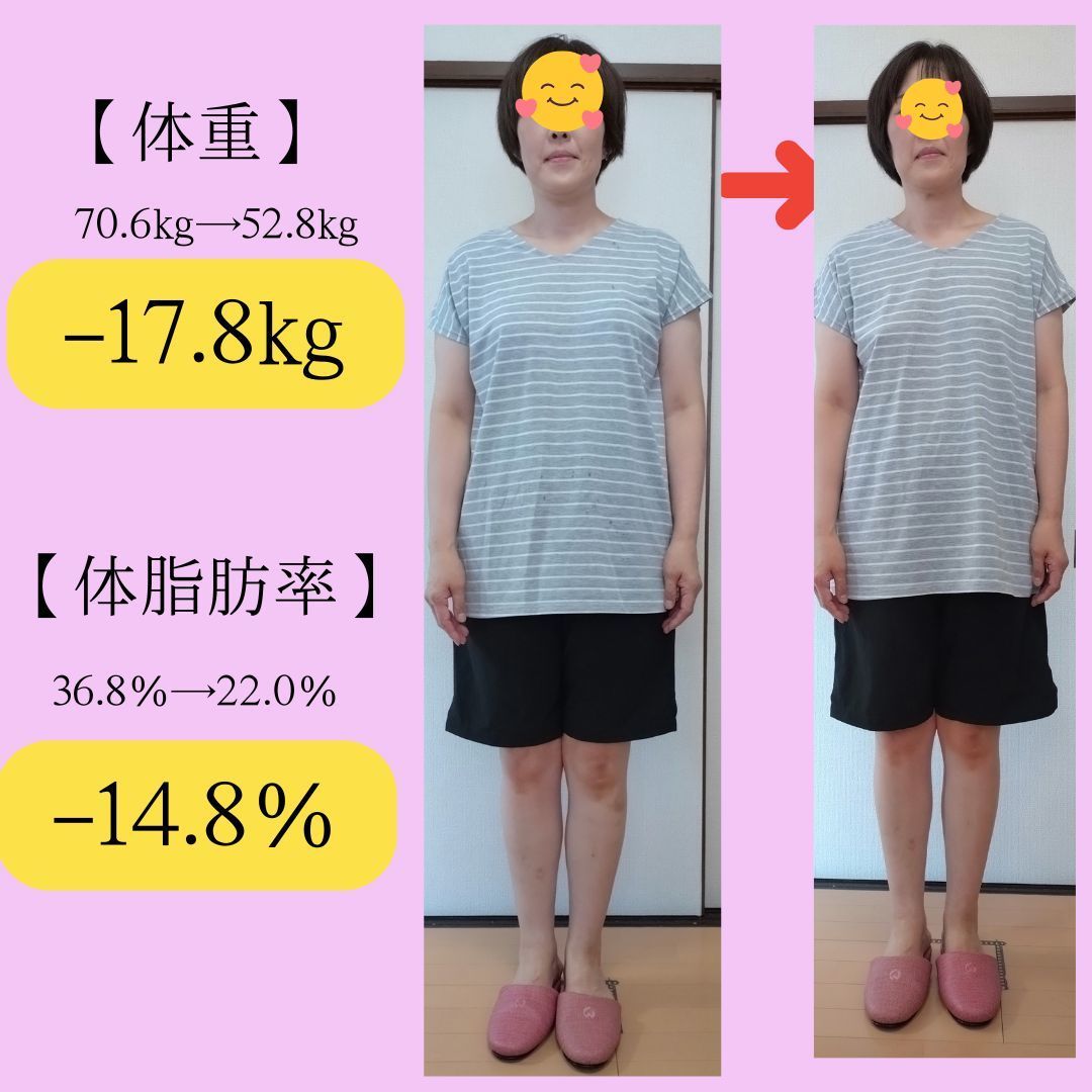 結婚を機に日本に来てから太り始め、4人の子供を出産するたびに太り続けてきました。体調も悪く喘息も悪化してきたころからダイエットをした方が良いと、漢字が苦手な私に変わり、「このダイエット良さそうだから、カウンセリングに行ってみたら?」と申し込みをしてくれました。3か月で10㎏減。その後のアフターフォローでも痩せ続け-16㎏落ちました。
