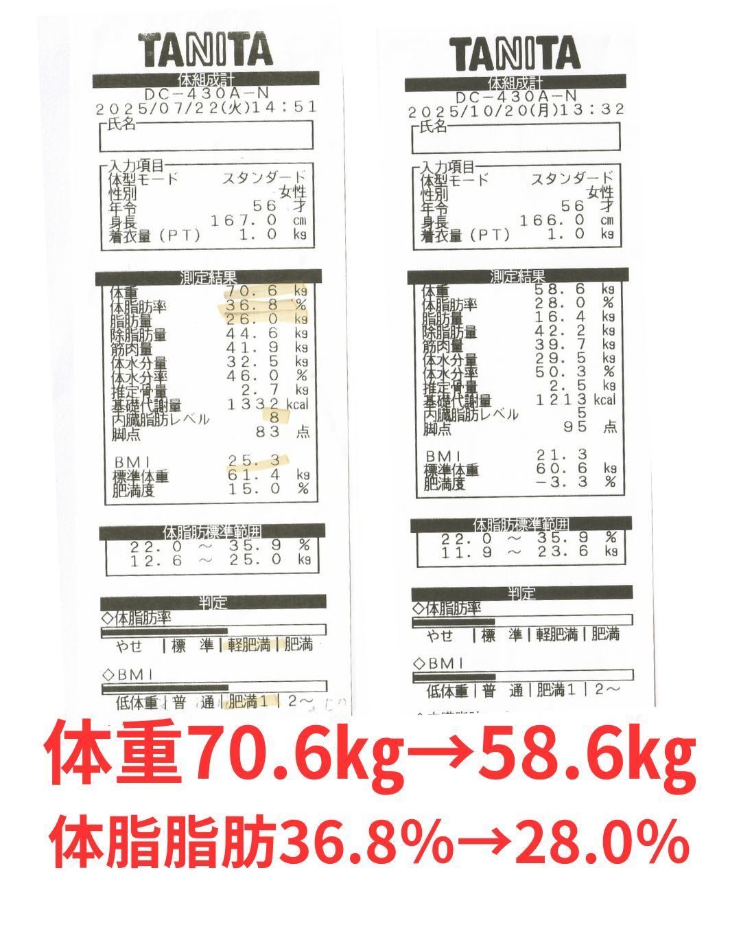 今までの食事量が多かったことを実感しました。食事量を見直して内容も変えていくと、測る度に体重が減っていきました。
