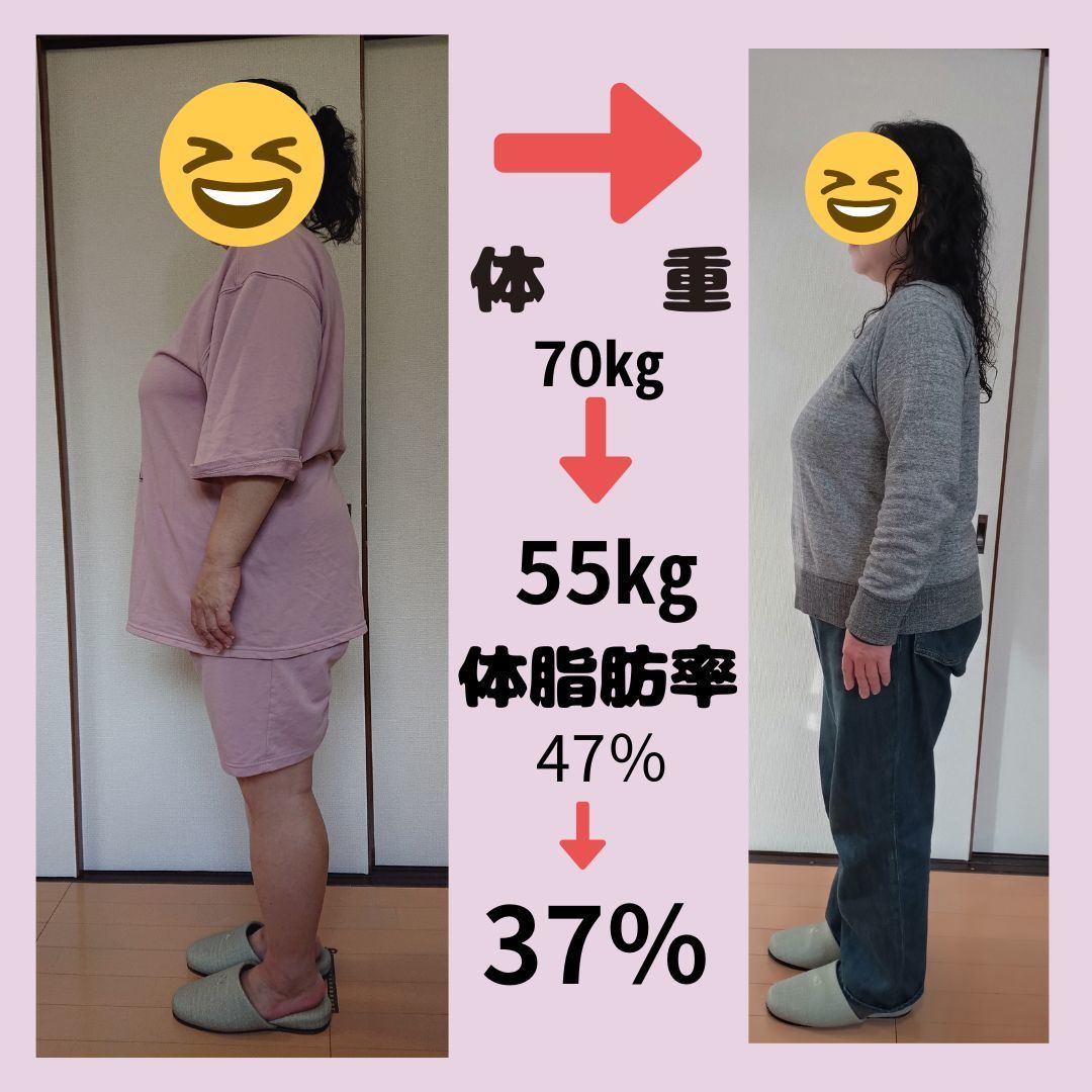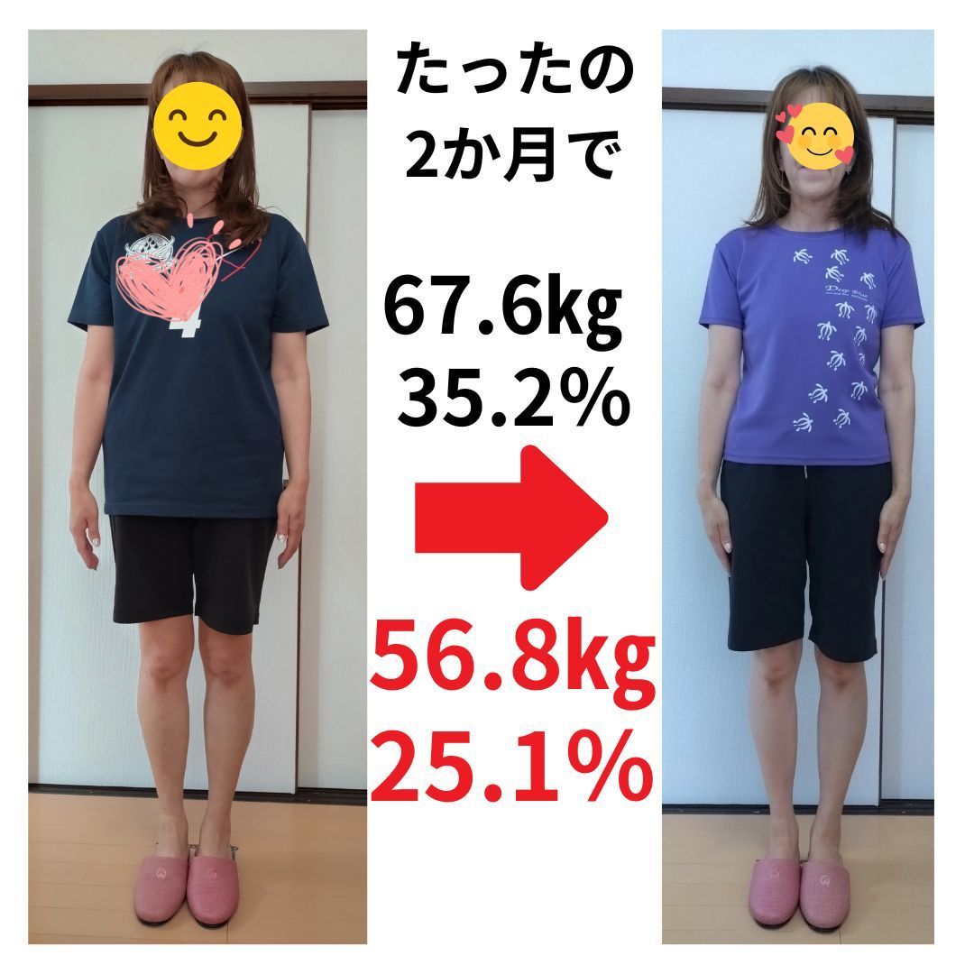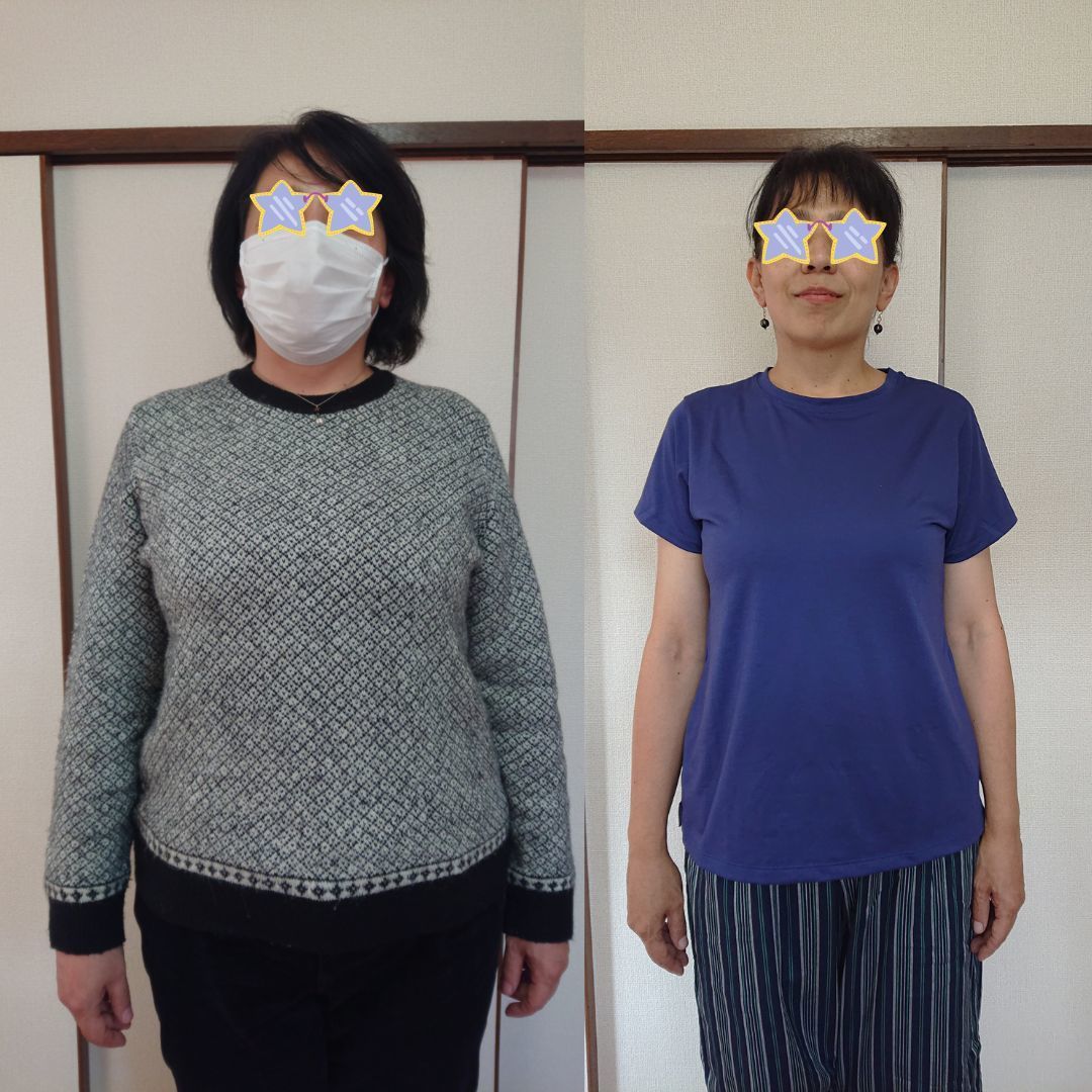 わずか2カ月間で約10㎏の体脂肪が燃焼されました。心配していた過敏性大腸症候群も改善され、気軽に出かけられます。やりたいと思ったことが全部できるようになり毎日が楽しくなりました。