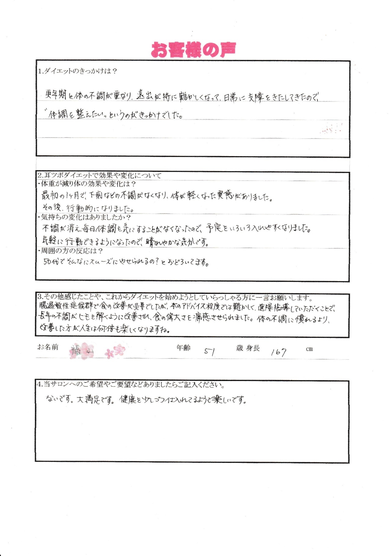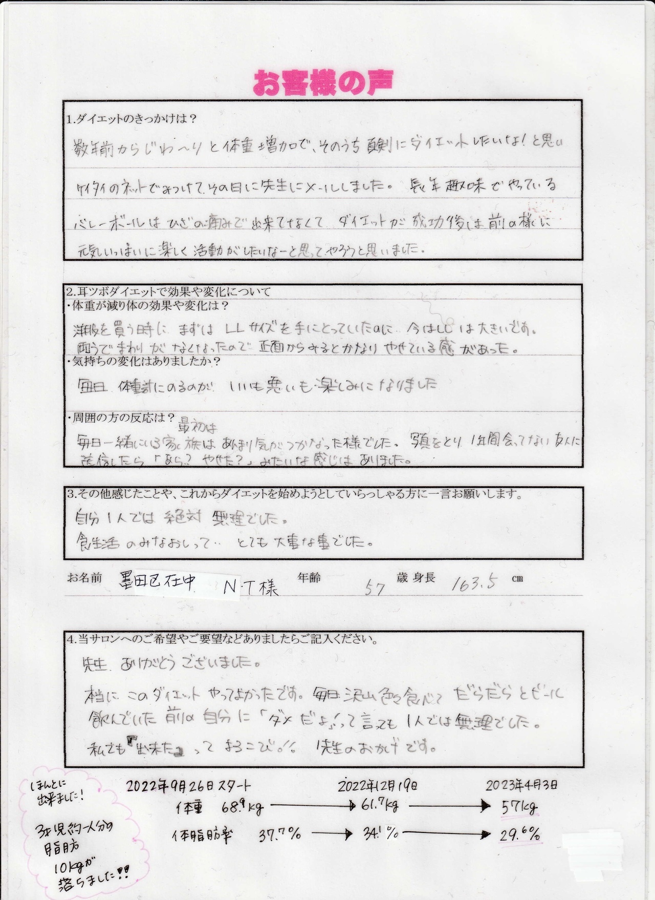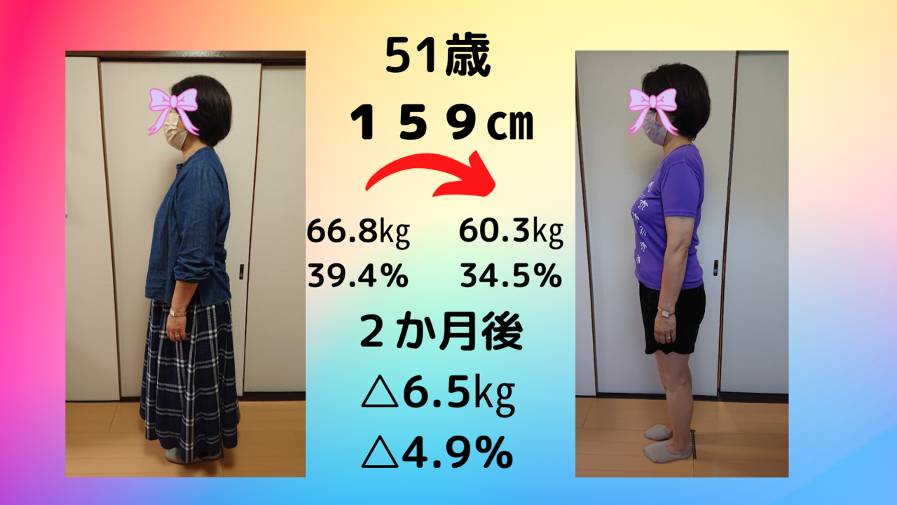 わずか2カ月間で約10㎏の体脂肪が燃焼されました。心配していた過敏性大腸症候群も改善され、気軽に出かけられます。やりたいと思ったことが全部できるようになり毎日が楽しくなりました。