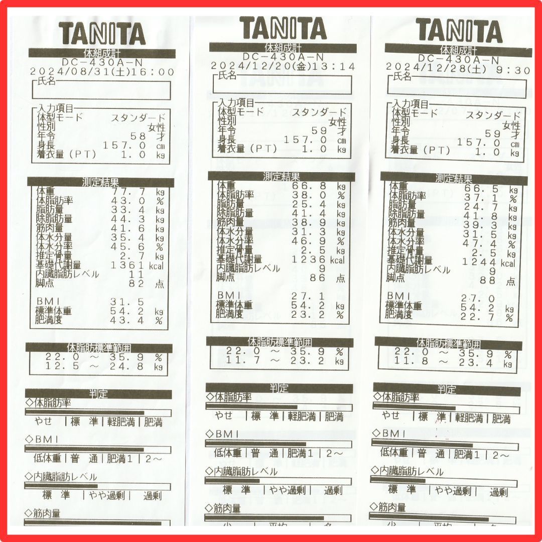 ■「健康になりたかった」から始めたダイエットです。8月に初めて12月の健康診断で改善されていたことが嬉しかった。数値が高い箇所も正常値に近い数値で安心しました。去年はメタボリック判定が「予備軍該当」で今年は「非該当」!血圧も135だったのが125。