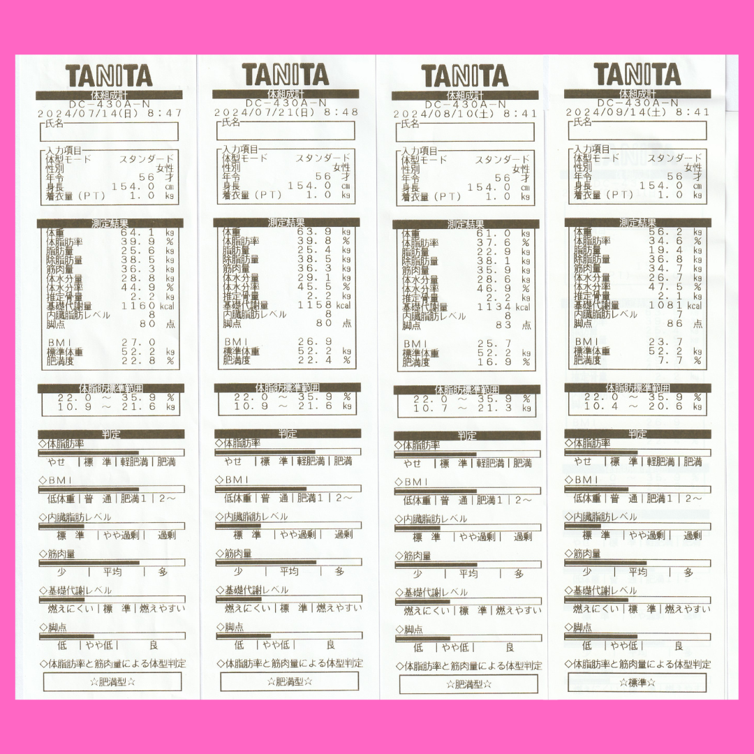 たったの1カ月で体重が5㎏減りました。計測で体脂肪量が5㎏減なので、明らかに体脂肪のみが体から出ていったのがわかります。週2回の耳ツボの貼り替えと、お食事指導、栄養素バランスの取れたお食事のサポートで、代謝が上がり脂肪がどんどん燃焼されていくのが実感できました。