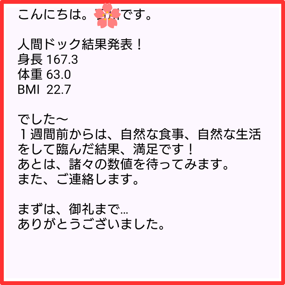 ■ダイエット卒業後の健康診断の結果が出て、一緒に喜んでもらおうとメールをしました。前回の健康診断では体重がいきなり増加のまさかの”危険信号”でした。体重が落とせただけではなくとても健康になりました。