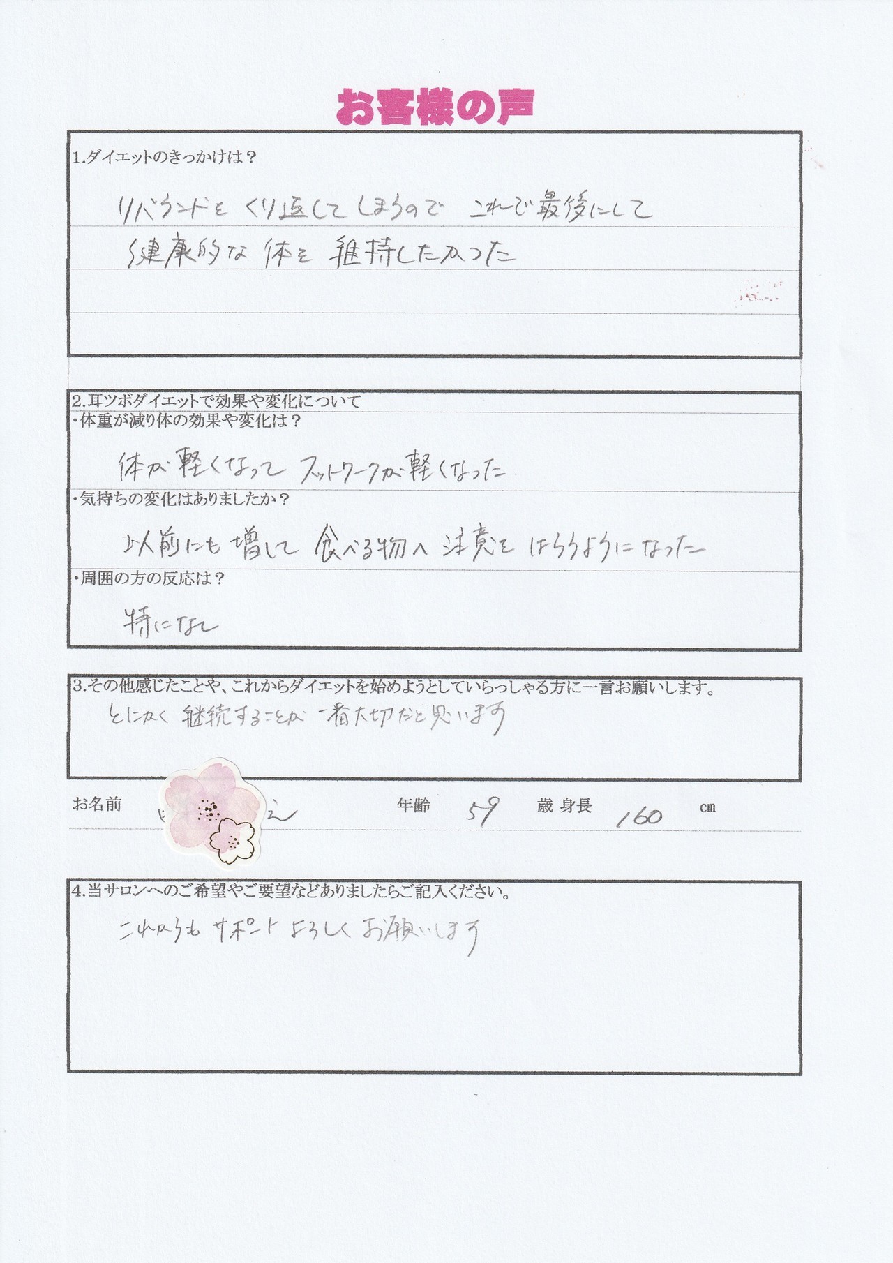 -10㎏も痩せたので、「どうやって痩せたの?」と、質問攻めになりました。”耳ツボダイエットって本当に痩せるんだね!”と、感心されました。サロンの場所を教えると”ちょっと遠いから…”と、いう理由で他のサロンさんに通う同僚もいました。